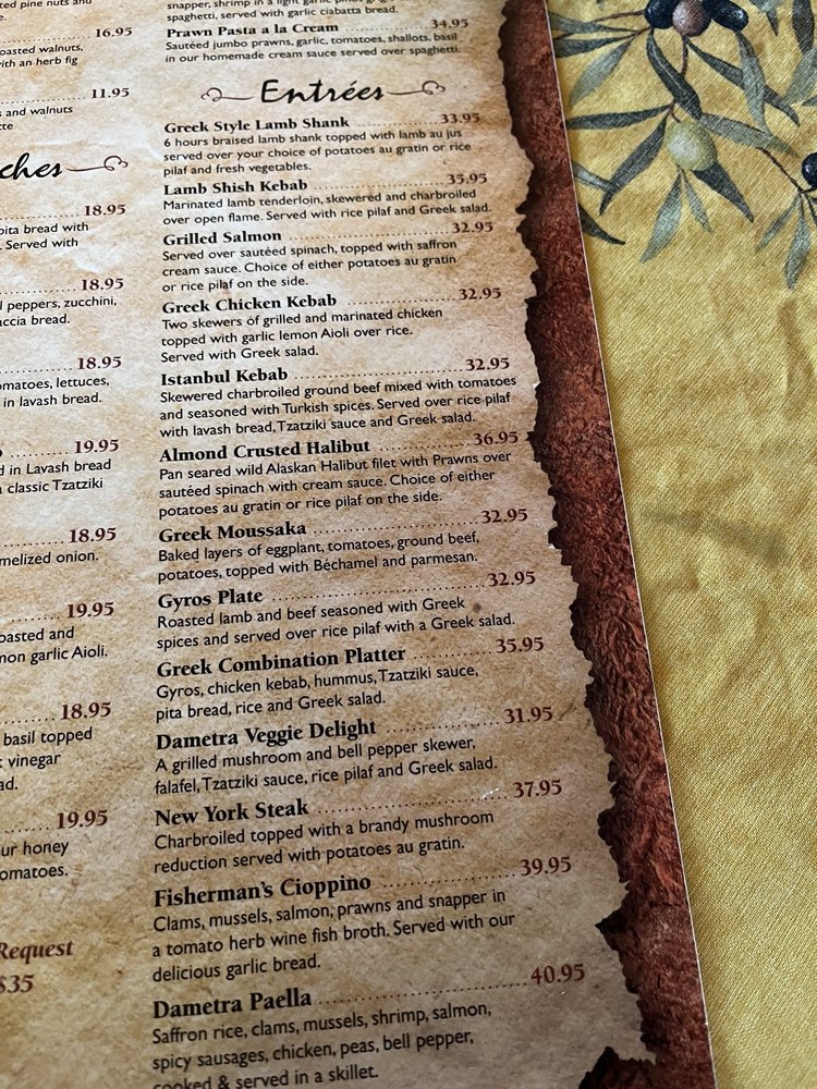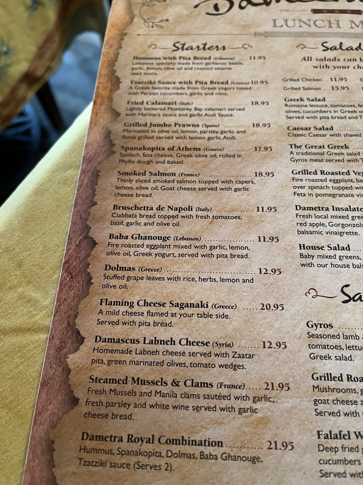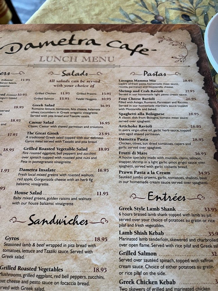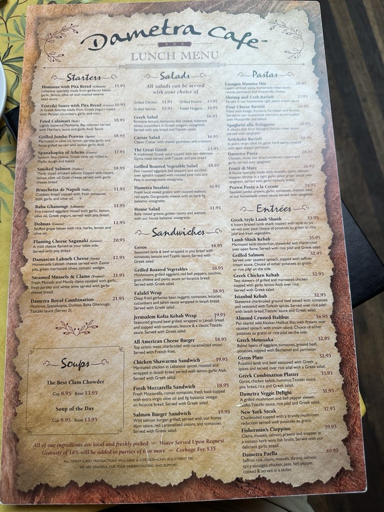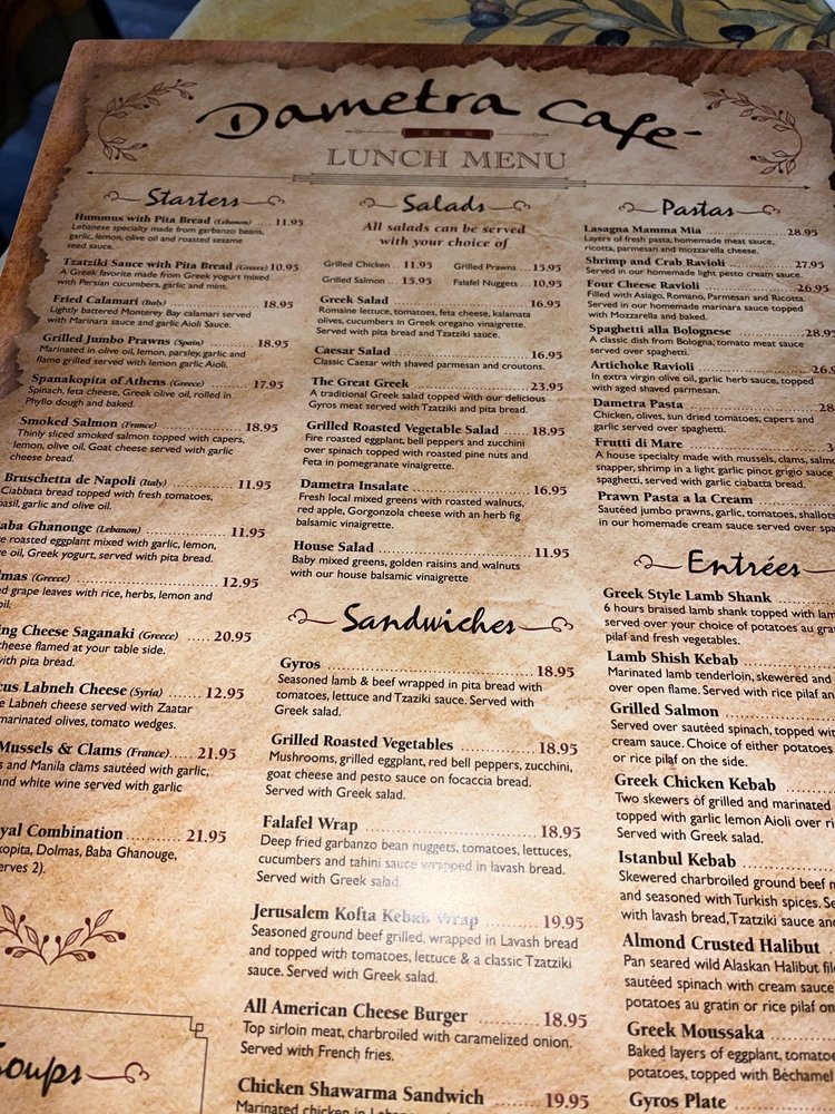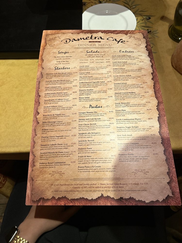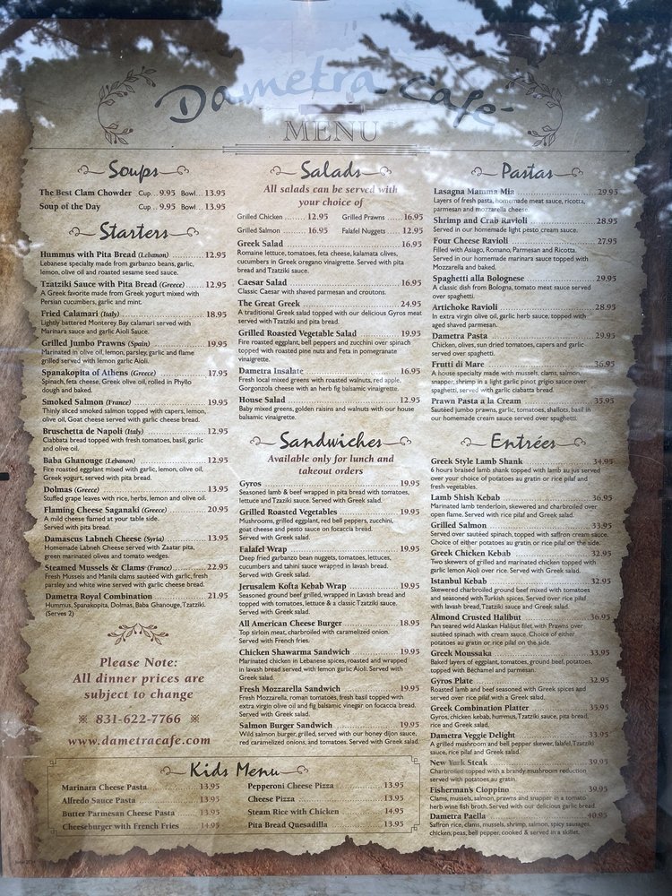 Located in Carmel-By-The-Sea, CA, Dametra Cafe offers a delightful blend of Greek, Mediterranean, and Wine Bar cuisine. With a menu that caters to vegans, vegetarians, and all food lovers, this casual restaurant provides an array of options for lunch and dinner. From starters like Hummus and Tzatziki Sauce with Pita Bread to hearty soups like Clam Chowder and salads like Greek and Caesar, the flavors are authentic and fresh. Customers praise the restaurant for its excellent service, live music, and vibrant atmosphere. The extensive menu also includes grilled jumbo prawns, grilled roasted vegetable salad, and gyro plates. Overall, Dametra Cafe stands out for its delicious food, welcoming ambiance, and diverse offerings.