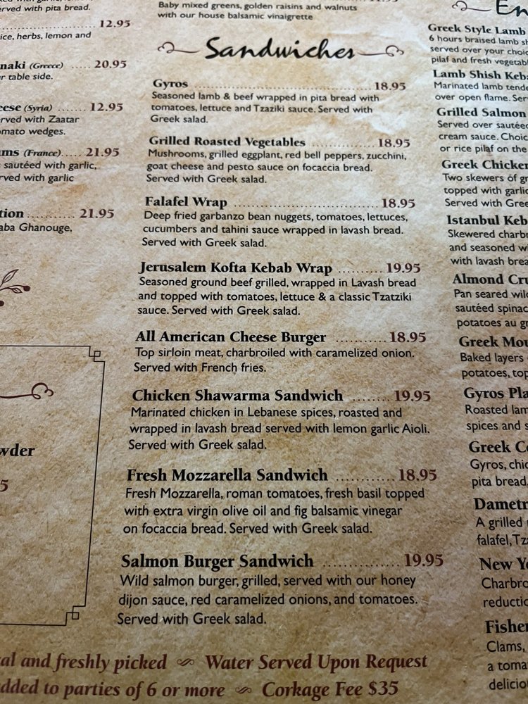 Seasoned lamb and beef, tomatoes, and lettuce wrapped in pita bread topped with tzatziki sauce.